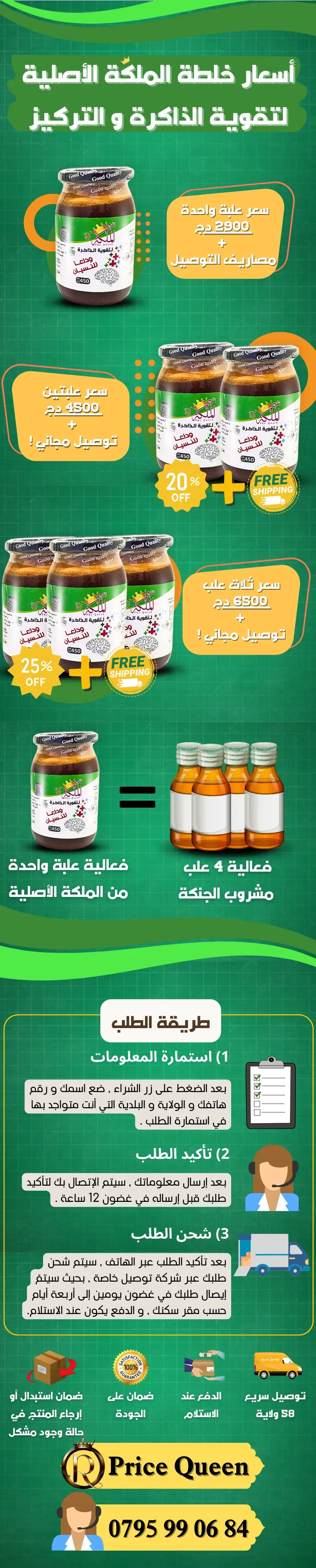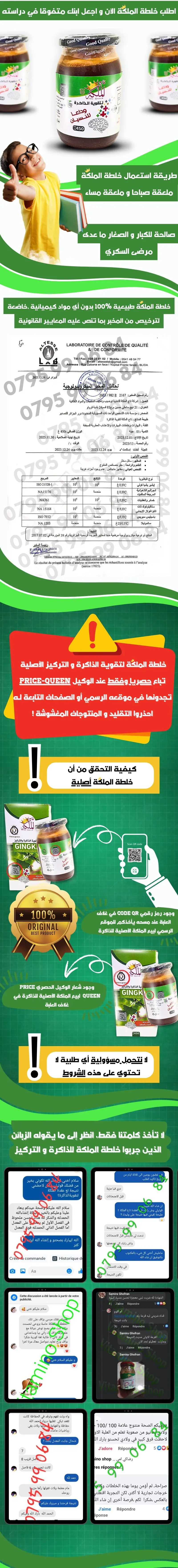 ✨ عقدة الملكة لتقوية الذكاء والتركيز ✨ هي تركيبة طبيعية 100% مخصصة لتعزيز القدرات العقلية 🧠 والتركيز 📚 لدى الأطفال 👶، الطلاب 👩🎓، وحتى كبار السن 👵. مزيج متوازن من المكونات الطبيعية مثل الجينكا 🍃، الزعتر البري 🌿، إكليل الجبل 🌱، الريحان 🌿، وحبة البركة 🌾، تم تصميمه خصيصًا لدعم صحة الدماغ 💡، تقوية المناعة 🛡️، وتحفيز النشاط الذهني ✨. الفوائد الرئيسية: 💡 تعزيز الذاكرة وزيادة التركيز. 🛡️ تقوية المناعة ومكافحة فقر الدم. 🍽️ فتح الشهية بطريقة طبيعية وصحية. 😌 تقليل التوتر والقلق العصبي. 🧓 محاربة النسيان ودعم الصحة العقلية لكبار السن، مما يساعد في تخفيف أعراض الزهايمر. 🌟 لماذا تختار "عقدة الملكة"؟ منتج طبيعي 100%، 450 غرام خالٍ من أي مواد كيميائية ❌🧪، مجرب وفعّال بشهادة العديد من الزبائن 🏆 ومصدق عليه من المخبر 🧪✅.