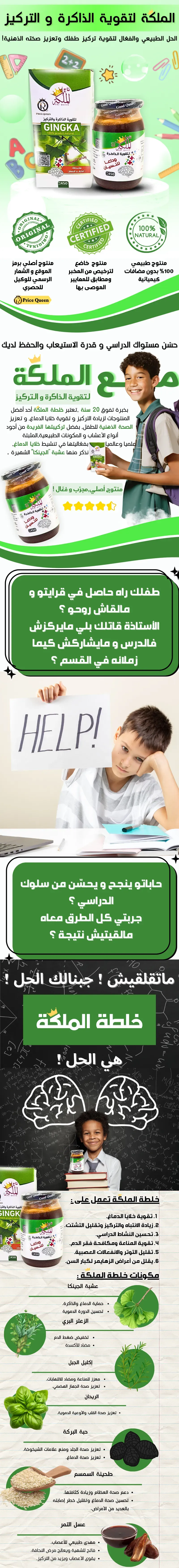 ✨ عقدة الملكة لتقوية الذكاء والتركيز ✨ هي تركيبة طبيعية 100% مخصصة لتعزيز القدرات العقلية 🧠 والتركيز 📚 لدى الأطفال 👶، الطلاب 👩🎓، وحتى كبار السن 👵. مزيج متوازن من المكونات الطبيعية مثل الجينكا 🍃، الزعتر البري 🌿، إكليل الجبل 🌱، الريحان 🌿، وحبة البركة 🌾، تم تصميمه خصيصًا لدعم صحة الدماغ 💡، تقوية المناعة 🛡️، وتحفيز النشاط الذهني ✨. الفوائد الرئيسية: 💡 تعزيز الذاكرة وزيادة التركيز. 🛡️ تقوية المناعة ومكافحة فقر الدم. 🍽️ فتح الشهية بطريقة طبيعية وصحية. 😌 تقليل التوتر والقلق العصبي. 🧓 محاربة النسيان ودعم الصحة العقلية لكبار السن، مما يساعد في تخفيف أعراض الزهايمر. 🌟 لماذا تختار "عقدة الملكة"؟ منتج طبيعي 100%، خالٍ من أي مواد كيميائية ❌🧪، مجرب وفعّال بشهادة العديد من الزبائن 🏆 ومصدق عليه من المخبر 🧪✅.